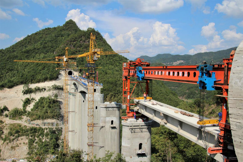 機(jī)組人員迎難而上,提前研判,反復(fù)計算,根據(jù)現(xiàn)場實際情況,大膽探索,制定了縝密的方案。將架橋機(jī)整機(jī)降低50厘米,將2號柱開出隧道,架橋機(jī)下運梁車受到隧道的限制,起升橋機(jī)高度必須能將運梁車和起升架吊出來,起升高度準(zhǔn)確計算到了厘毫,把吊梁鋼絲繩縮短1.8米,做到鋼絲繩剛好能掛上且能把梁體吊起。過孔時只有輔助支腿和1號柱才能出隧道,由于架橋機(jī)起不到高度,是最低位過孔,需要反復(fù)調(diào)整各個支腿及高度。大臂橫移時后動力倉平臺距離隧道口內(nèi)壁只有1厘米距離,設(shè)有專人盯控。架梁前對架橋機(jī)反復(fù)進(jìn)行空載試驗,確認(rèn)無誤后,開始對首片T梁進(jìn)行架設(shè),經(jīng)過大家的努力,終于破解難題,圓滿完成了隧道口橋梁架設(shè)任務(wù)。
