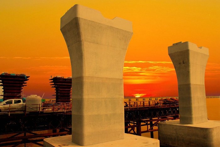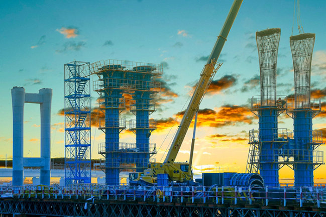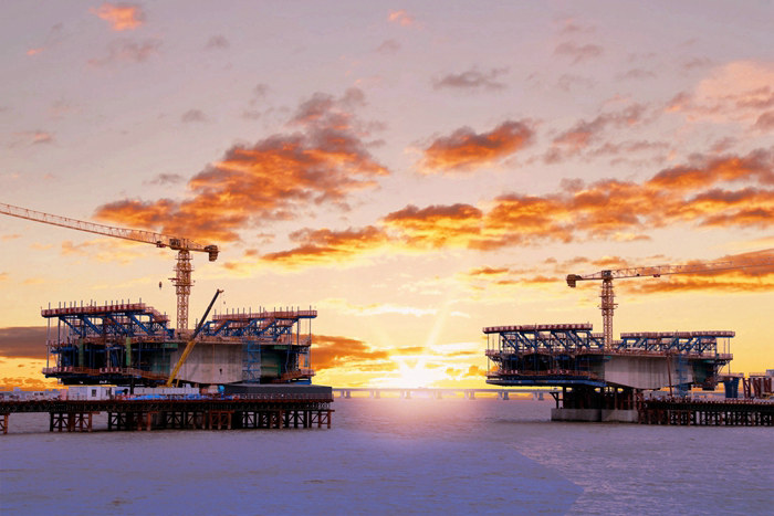 為了高效優(yōu)質、安全地完成建設任務,項目部選用20多支優(yōu)秀施工隊伍和供應及時的材料供應商。同時云集了100多臺大中型設備,在兩座大橋上掀起大干熱潮。廣大員工戰(zhàn)臺風、冒酷暑、斗嚴寒,與時間賽跑,克服難以想象的各種困難,經(jīng)過不懈努力,截止今年11月中旬,累計完成鋼棧橋13000多米,濱海高架橋安全跨越水下17條管線,鋼棧橋成功下穿金塘大橋,濱海高架主體工程完工指日可待,濱海樞紐立交棧橋、樁基、承臺、橋墩施工如火如荼,鋼混組合梁已經(jīng)投產(chǎn),第一片梁即將加工制作成功,截止2021年10月,該項目完成產(chǎn)值14.34億元,占合同總額的66.55%,今年業(yè)主給下達8.4億元產(chǎn)值計劃,如期完成勝券在握。