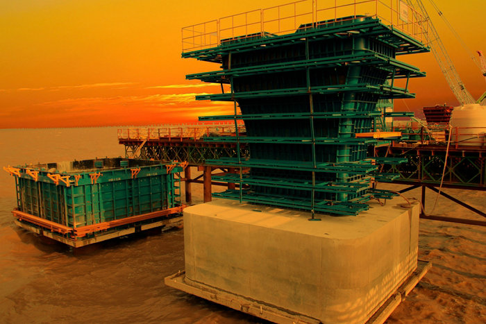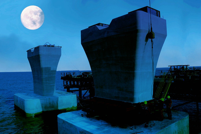 該公司承建的杭甬復線濱海高架橋和亞洲最大的海上互通濱海樞紐,全長14.9公里,設計樁基總量1745根172225延米,最長樁111.4米,最短樁74米,樁徑1.8—2.5米。橋梁承臺348座,大多數(shù)為矩形狀,少量為H型,主線和匝道均為高樁承臺,金塘拼寬橋為埋設承臺。兩座橋墩身810座,其中主線橋墩和拼寬橋為片式花瓶墩,8座匝道橋為圓柱墩+系梁,墩身設計634座,最高墩25.25米,最低6米,鋼混組合梁230孔,混凝土總量68.2萬立方,鋼筋7.265萬噸,鋼箱梁2.4萬噸,最重單塊梁體1700多噸。該標段暫定合同金額21.547億元。2018年8月8日簽訂下部結構合同,2019年8月正式開工。