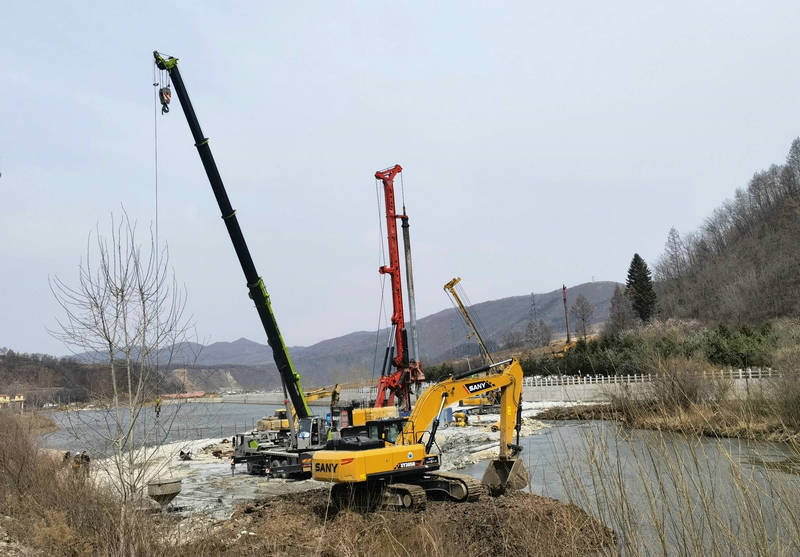 該橋先后跨越渾白鐵路、縣道X096及雙河三級(jí)電站庫(kù)區(qū)。其中1#橋墩坐落于山坡上,下方為X096縣道。2#-3#橋墩之間跨越既有渾白鐵路,3#-7#橋墩處于雙河三級(jí)電站庫(kù)區(qū)的涉水區(qū),需要利用6000立方米石料在水中先行筑島,改移河道后方可開工建設(shè)。面對(duì)工期緊迫、地質(zhì)條件差、周邊環(huán)境復(fù)雜、跨越既有線施工安全風(fēng)險(xiǎn)高等不利因素,中鐵二十三局集團(tuán)沈白高鐵項(xiàng)目部把保證工程安全和質(zhì)量做為重中之重,加大人財(cái)物等資源的投入力度,不斷優(yōu)化施工組織設(shè)計(jì)。將采取集中優(yōu)勢(shì)兵力打殲滅戰(zhàn)的辦法,晝夜不停、連續(xù)作戰(zhàn),全力以赴搶進(jìn)度,確保在三個(gè)月內(nèi)完成3#-7#涉水橋墩施工,突破制約工程進(jìn)度的瓶頸。為鉆孔樁、承臺(tái)、墩身,以及后續(xù)的軌道鋪設(shè)施工創(chuàng)造條件。同時(shí),他們將嚴(yán)把跨越及鄰近既有線作業(yè)安全關(guān),嚴(yán)格執(zhí)行作業(yè)標(biāo)準(zhǔn)和有關(guān)卡死卡嚴(yán)制度,確保渾白鐵路大動(dòng)脈運(yùn)輸?shù)慕^對(duì)安全。
