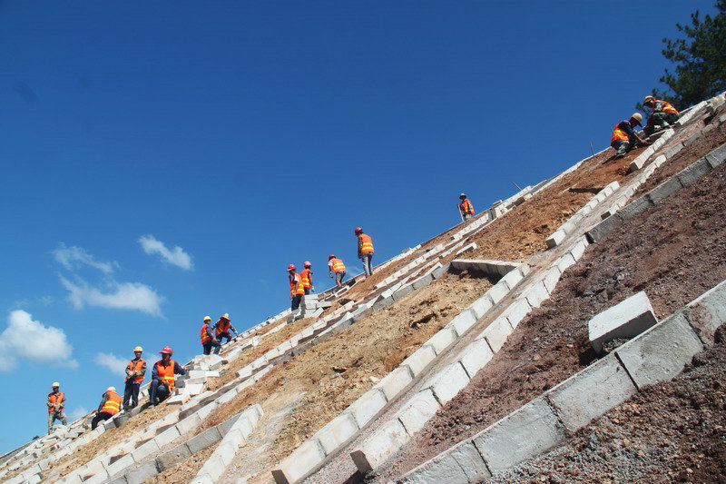 觀摩團(tuán)先后到項(xiàng)目路基附屬工程的四個(gè)施工段現(xiàn)場(chǎng)觀摩學(xué)習(xí)?,F(xiàn)場(chǎng)施工技術(shù)員介紹了DK104+127-DK108-186施工概況。其地形復(fù)雜,橋梁施工工點(diǎn)比例大,施工區(qū)段路基多為路塹,最高邊坡為五級(jí)邊坡。為保證路塹開挖安全,路塹開挖邊坡防護(hù)采用開挖一級(jí)防護(hù)一級(jí),該區(qū)段已開挖出的坡面防護(hù)措施為4×3漿砌片石人字型骨架內(nèi)灌草護(hù)坡、4×4錨桿框架梁內(nèi)灌草護(hù)坡、人字形骨架護(hù)坡,主骨架間隔4米,支骨架間隔3米進(jìn)行設(shè)置;錨桿框架梁錨桿為單束直徑為32毫米的鋼筋,錨桿鉆孔直徑為110毫米。