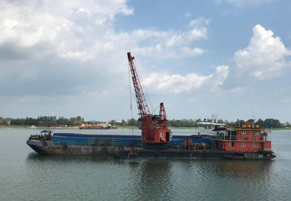 為了保證圍堰順利下水,河床清淤是當(dāng)前首要任務(wù),為此項(xiàng)目部引進(jìn)了具有GPS精確定位的抓斗船2艘,500噸運(yùn)輸船1艘,并且安排專人值守保證24小時(shí)不間斷作業(yè),確保主墩位置河床淤泥、石渣清理徹底,為后續(xù)圍堰下水打下堅(jiān)實(shí)的基礎(chǔ)。項(xiàng)目部要求抓斗船在水上施工作業(yè)中嚴(yán)格遵循文明與環(huán)保施工措施,清理出來(lái)的淤泥在岸邊指定的位置堆棄,防止污染巴河水域。石渣則用于項(xiàng)目便道填筑、路堤本體填料等項(xiàng)目,達(dá)到變廢為寶的目的。