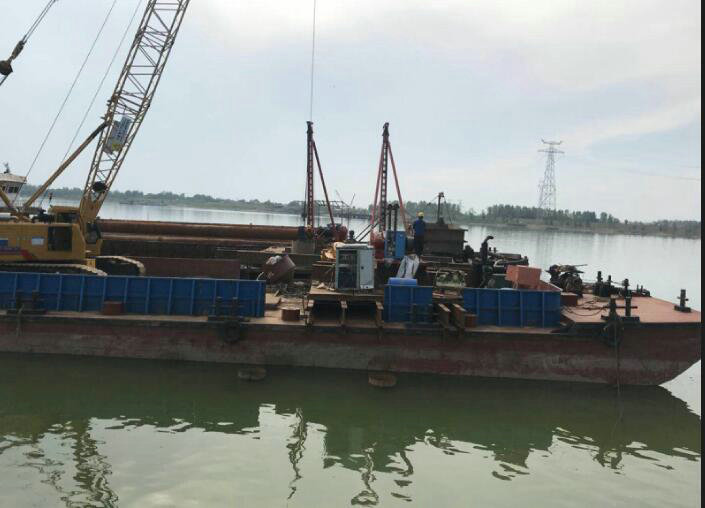 浠水側(cè)鋼棧橋隨著工程推進(jìn),遇到了“攔路虎”,該段地質(zhì)復(fù)雜,河底均為大塊鵝卵石,硬度很高,鋼管樁難以打入。根據(jù)評(píng)審?fù)ㄟ^的專項(xiàng)施工方案,當(dāng)鋼管樁達(dá)不到入巖深度6.5米要求時(shí),管樁基礎(chǔ)施工采用“沖孔栽樁”的工藝進(jìn)行沖孔作業(yè),保證整個(gè)棧橋結(jié)構(gòu)的整體穩(wěn)定性。
