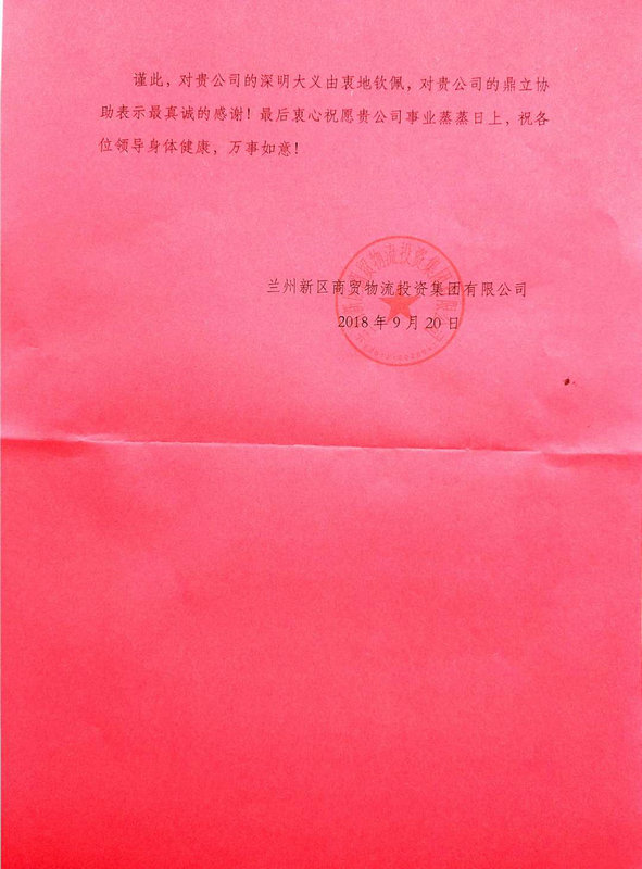信中指出:精準扶貧系國運,幫扶援建暖民心。貴公司深明脫貧攻堅之大義,在接到救援扶助信后,特派蘭州新區(qū)鐵路口岸貨4、貨7線項目部,在項目部副經理劉明兒的親自督導下,僅用3天時間便完成了對建新村村委會的改造工程任務。共重修圍墻180米、新建廁所20平米、新建庫房40平米,總投資10萬元。項目部主要負責人于百忙之中到我單位幫扶村進行實地調研與商談結對聯系工作,為建新村迅速制定了援建計劃,在促進新區(qū)商貿物流投資單位脫貧攻堅工作的同時,提振了幫扶村脫貧致富、振興發(fā)展和建設全面小康社會的信心,樹立了發(fā)揮合力共推脫貧攻堅行動的典范。