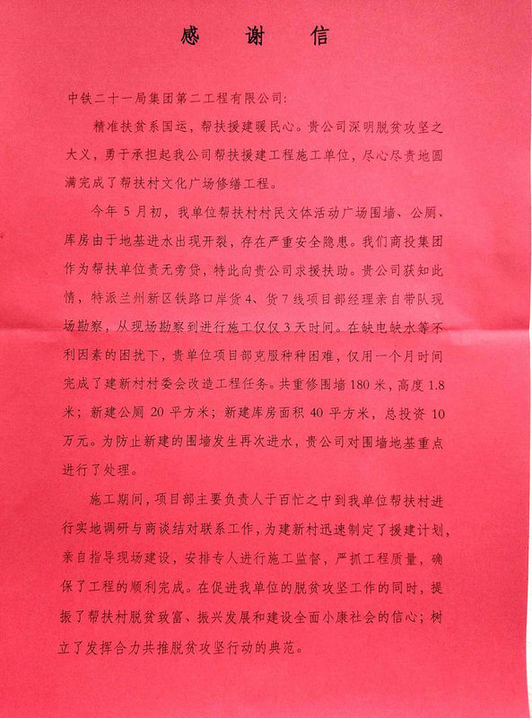 —— ——中鐵二十一局二公司貨四貨七項目部援建當地行政村收到表揚信