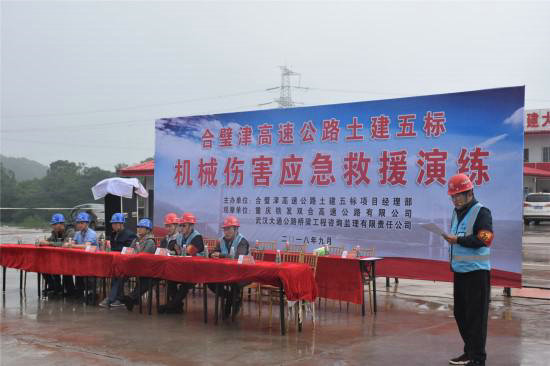 9月28日,“十一”國慶前夕,為切實做好節(jié)日期間的安全生產(chǎn)工作,結(jié)合實際工作計劃,合璧津高速公路土建五標組織開展了機械傷害應(yīng)急演練活動。合璧津高速公路第二總監(jiān)辦領(lǐng)導(dǎo)、龍華鎮(zhèn)政府領(lǐng)導(dǎo)及龍華鎮(zhèn)中心醫(yī)院醫(yī)務(wù)人員出席活動。35名項目管理及施工人員參加此次活動。