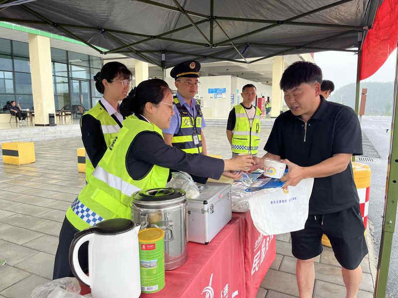 恰逢陰雨連綿,服務(wù)區(qū)工作人員為旅客送上自己手工包制的粽子、熱騰騰的茶水和咖啡,還貼心準(zhǔn)備了雨傘、簡易雨衣。高速公安、高速執(zhí)法單位人員利用旅客領(lǐng)取粽子、飲品時機發(fā)放交通法宣傳手冊,逐車逐人進行雨天行車安全提醒。