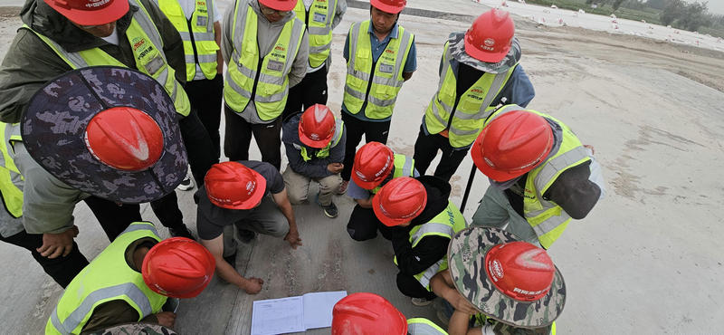 理論沉一線,破解技術(shù)堵點(diǎn)。項(xiàng)目將課堂搬到施工前沿,開展“圖紙+現(xiàn)場+問題”三位一體教學(xué)。在橋涵過渡段,技術(shù)負(fù)責(zé)人演示“壓實(shí)度分層測控法”,精準(zhǔn)控制攤鋪與碾壓參數(shù),消除“橋頭跳車”隱患;路面作業(yè)區(qū)里,技術(shù)人員邊學(xué)水穩(wěn)層配比理論,邊實(shí)操攤鋪校準(zhǔn)與碾壓調(diào)試,掌握“毫米級(jí)”精度;塔里木河特大橋現(xiàn)場,技術(shù)人員認(rèn)真記錄要點(diǎn),形成“學(xué)、看、解”閉環(huán)。