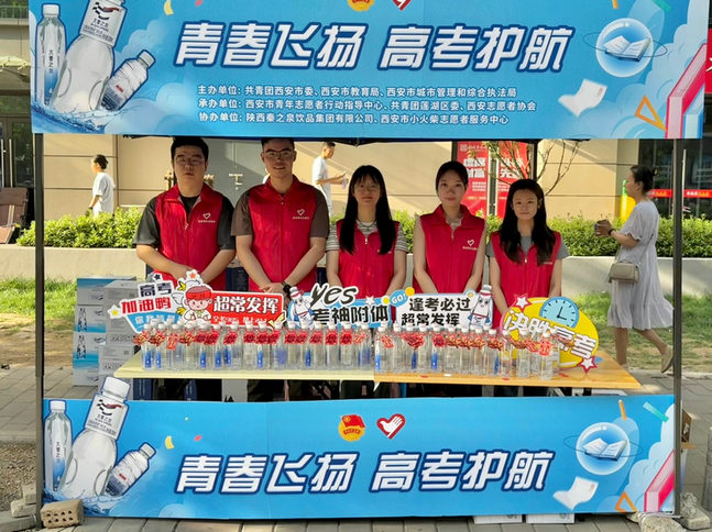 早晨7點,西安公司的青年志愿者們已早早來到西安市第十中學(xué)考點,搭建帳篷,擺放桌椅、物資,確保第一批到考場的考生就能喝上清涼的水,用實際行動為高考學(xué)子圓夢之路“保駕護航”。