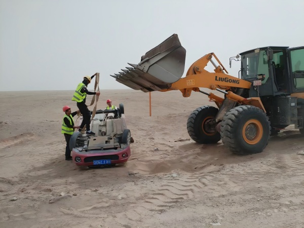項(xiàng)目安全負(fù)責(zé)人王明海,迅速指揮調(diào)配附近的機(jī)械班組開來一臺裝載機(jī)。裝載機(jī)龐大的身軀在沙漠中如同一頭鋼鐵巨獸,沉穩(wěn)而有力。他一邊安撫傾翻車輛駕駛員的情緒,說到:“別慌,有我們在!”一邊和同伴熟練地將牽引帶固定在車輛上并時(shí)刻專注地檢查固定情況,確保每一個(gè)環(huán)節(jié)都不出差錯(cuò)。酷熱的荒漠中他們的眼神中透著堅(jiān)定與果敢,汗水順著臉頰滑落,浸濕了領(lǐng)口,卻絲毫沒有影響他們救援的動(dòng)作。
