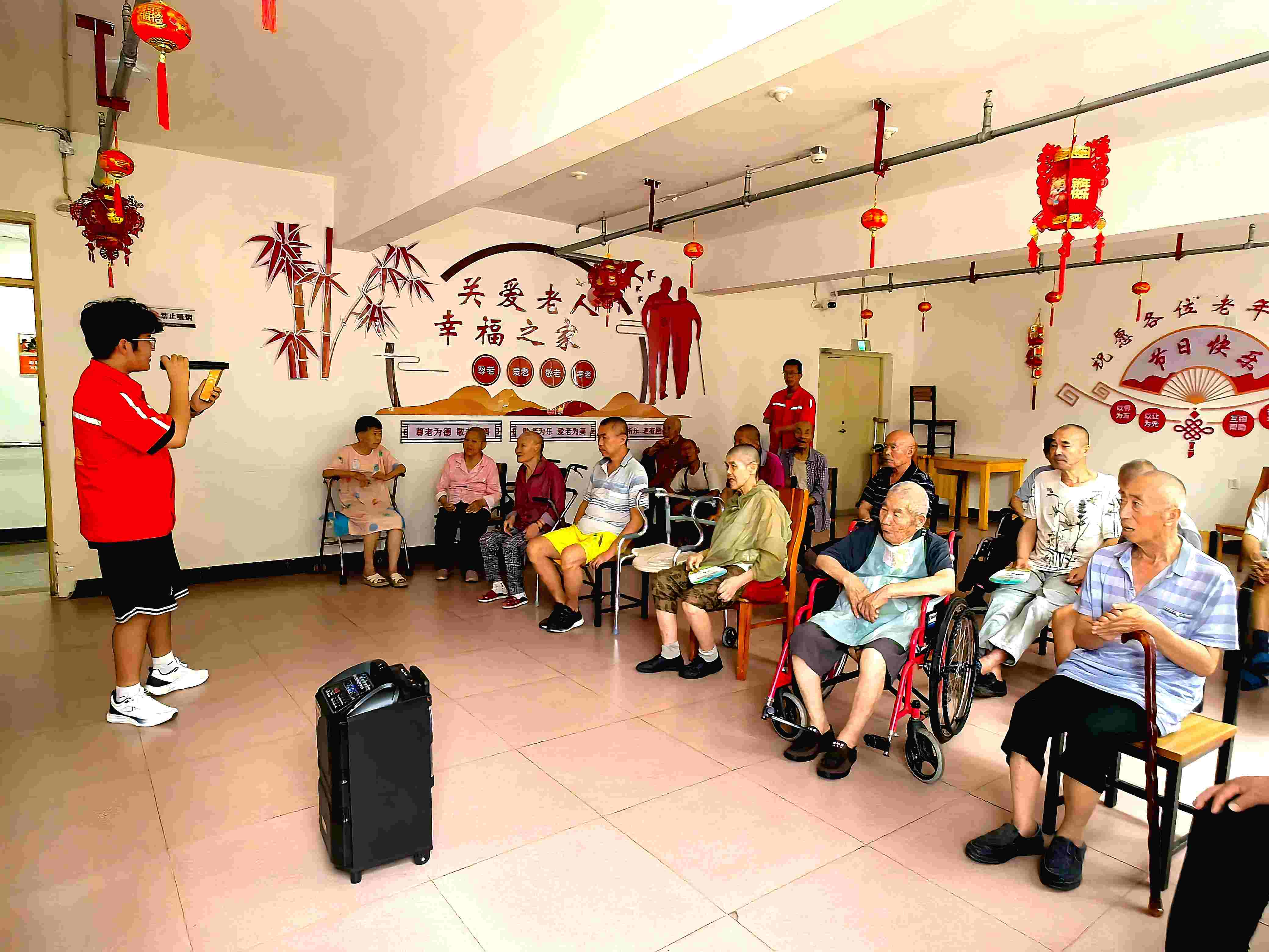 志愿者們來到活動(dòng)室與老人們一起做健身操強(qiáng)身健體;共玩“你畫我猜”比拼默契,鍛煉反應(yīng)能力;共唱歌曲《最親的人》歌曲,伴隨著音樂聲,整個(gè)活動(dòng)室充滿了歡聲笑語。