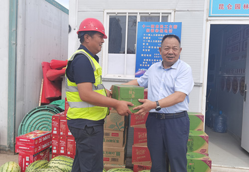 烏魯木齊訊(通訊員 趙泉友)盛夏時(shí)節(jié),熱浪襲人,高溫天氣給一線職工帶來嚴(yán)峻考驗(yàn)。7月30日,建咨集團(tuán)黨委書記、董事長鄧如才,赴昆侖園林公司承接的金風(fēng)科技白鳥湖創(chuàng)新中心項(xiàng)目二期三期景觀綠化工程項(xiàng)目,為在高溫中堅(jiān)守崗位的職工們送去夏日的清涼與慰問。