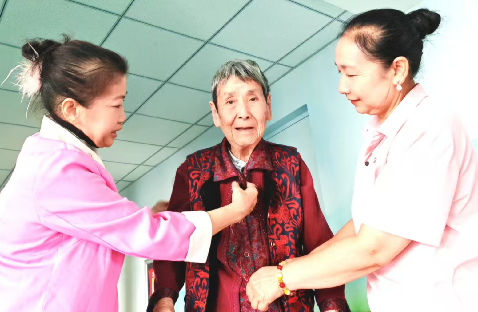 圖4為:奇臺(tái)110社區(qū)吾家樂(lè)寶養(yǎng)老院自理區(qū)的護(hù)理員們,為新入住該養(yǎng)老院的孫相云奶奶(左二)整理穿著,正準(zhǔn)備幫助孫相云奶奶到該養(yǎng)老院“養(yǎng)生堂”餐廳用早餐。