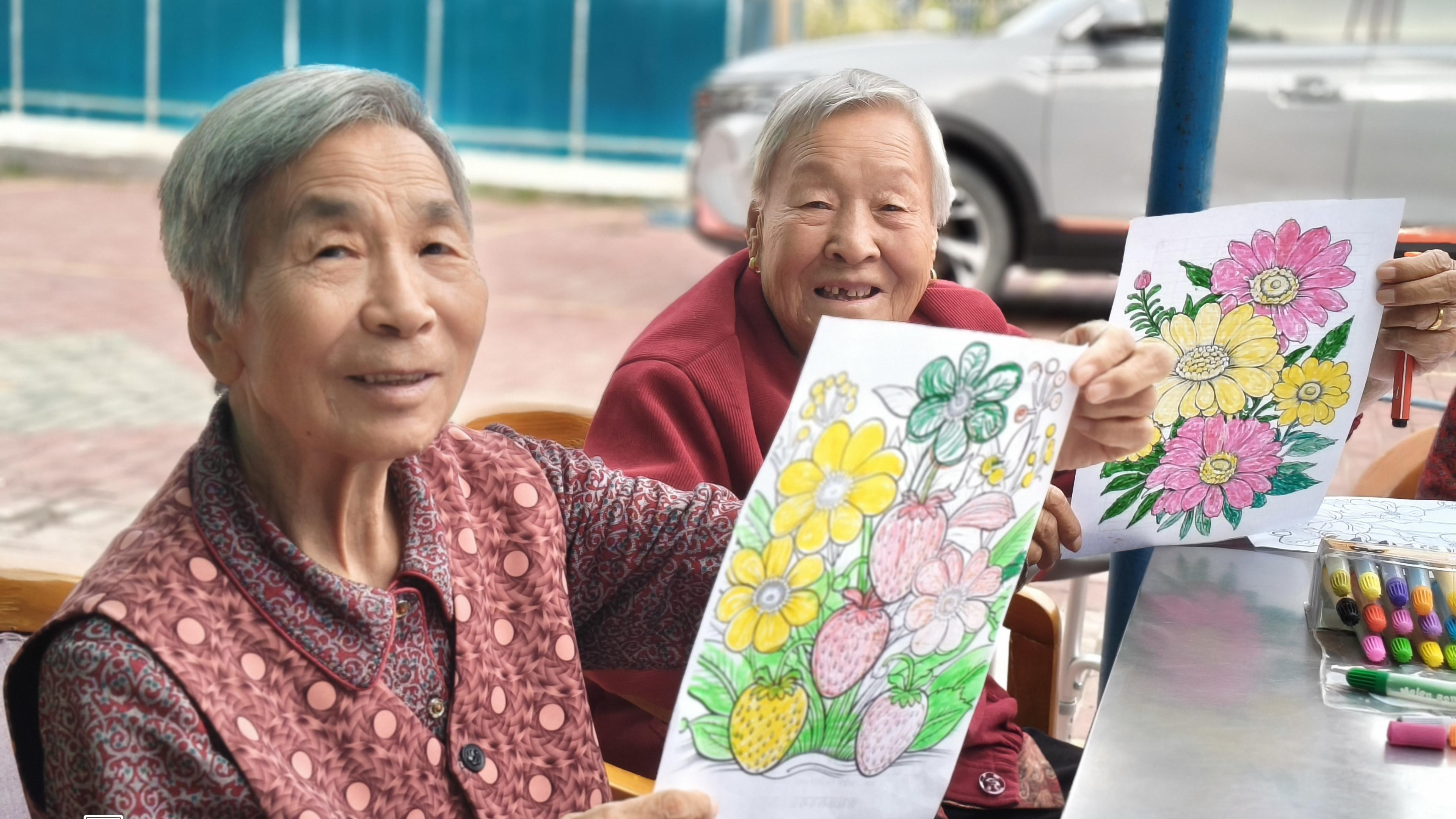 老人們圍坐在一起,有的專注地給云朵涂上天藍(lán)色,有的討論著樹葉該用深綠還是淺綠,偶爾傳來一句“你這顏色涂出邊啦”,惹得大家哈哈大笑。89歲的王奶奶行動(dòng)稍緩,護(hù)工便握著她的手,一起在畫紙上點(diǎn)染出幾朵粉色的桃花。“這花跟我年輕時(shí)院子里種的一模一樣。”王奶奶望著畫紙,眼里泛起了光,仿佛回到了歲月深處的時(shí)光。