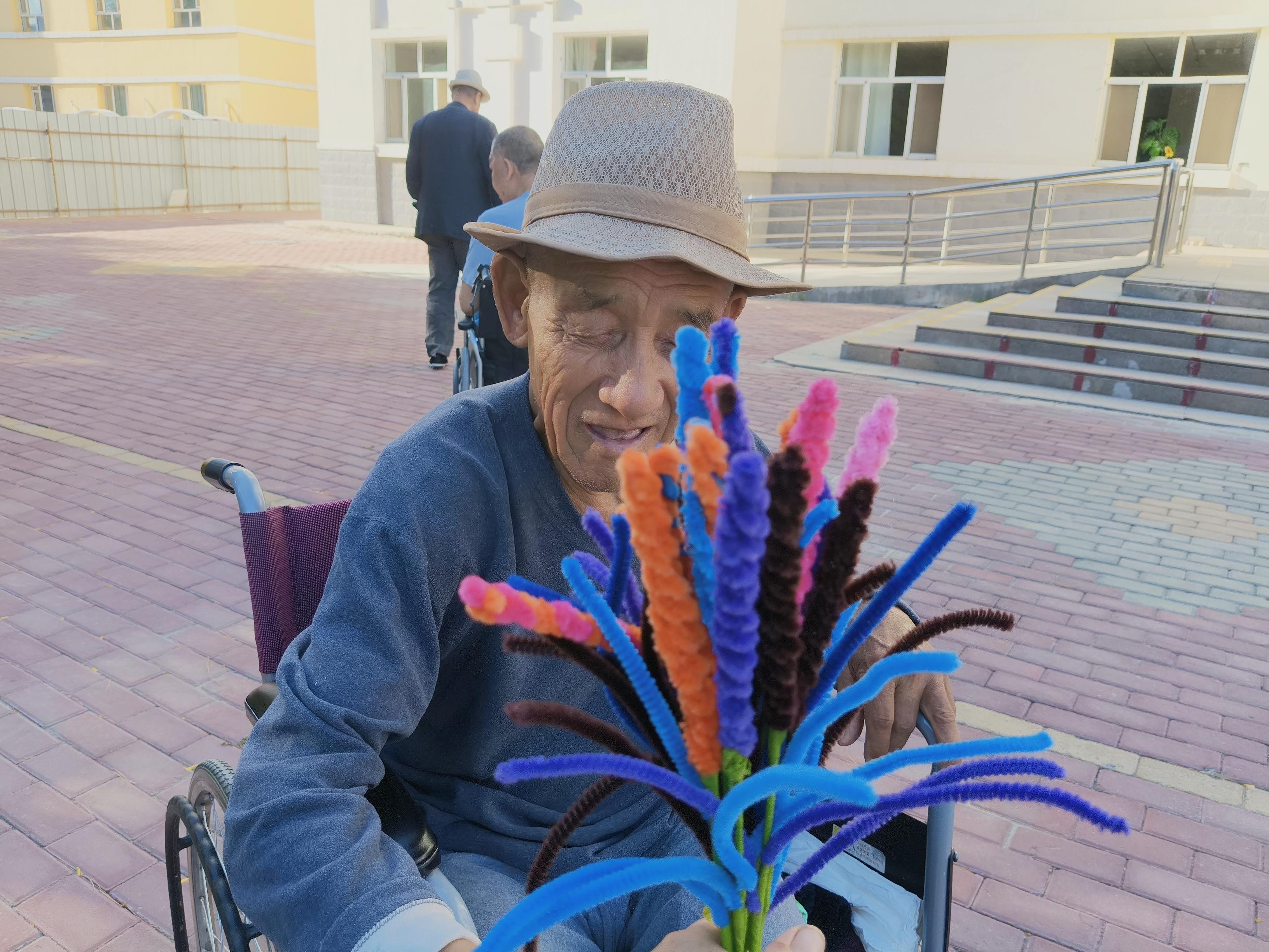 一個(gè)小時(shí)的活動(dòng)結(jié)束后,老人們的面前擺滿了親手制作的“薰衣草”花束。有的老人將花束插進(jìn)小花瓶,擺在活動(dòng)室的窗臺(tái)上;有的則小心翼翼地用紙巾包好,說(shuō)要帶回家做紀(jì)念。82歲的趙奶奶捧著花束,臉上笑開(kāi)了花:“這輩子沒(méi)種過(guò)薰衣草,沒(méi)想到用扭扭棒‘種’出來(lái)了,看著就心里敞亮!”