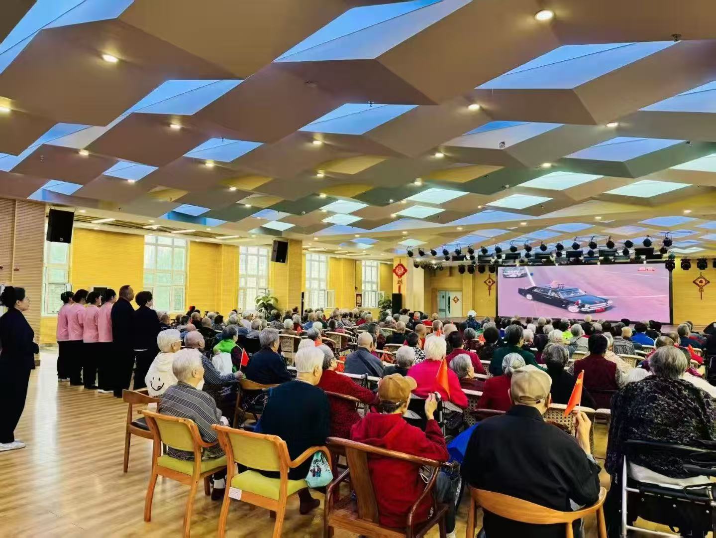 早餐過后,老人們便懷著激動(dòng)的心情早早來到小鎮(zhèn)禮堂。有的老人在工作人員的攙扶下緩緩入座,有的則相互交流著對閱兵儀式的期待,禮堂內(nèi)處處洋溢著期待與莊重的氛圍。