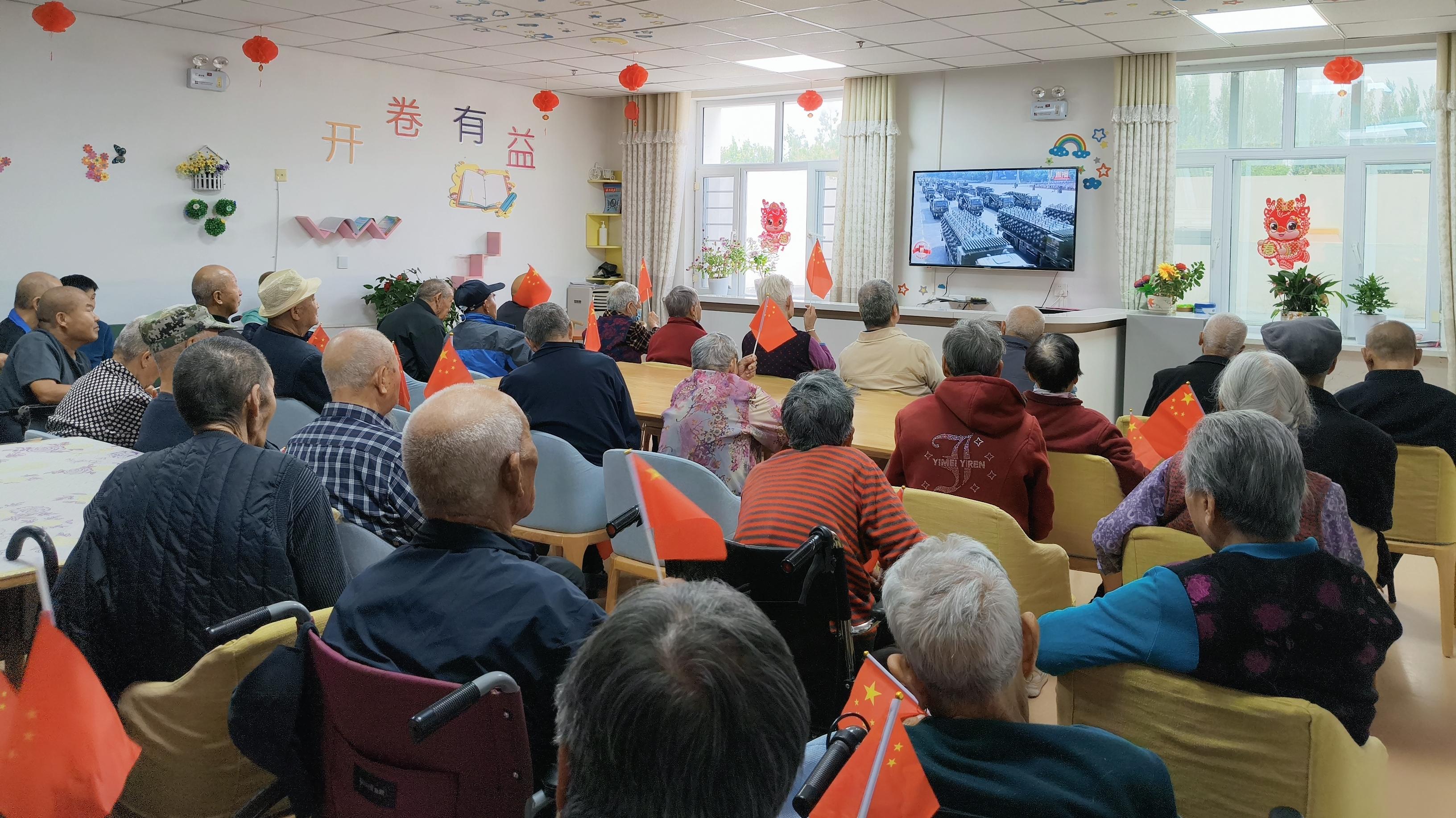 上午9時,老人們便早早來到活動大廳,滿懷期待地坐在電視機(jī)前。當(dāng)莊嚴(yán)的國歌響起,全體老人和工作人員自發(fā)起身,神情肅穆,齊聲高唱國歌,向國旗致以最崇高的敬意。那一刻,愛國之情在每個人心中澎湃。