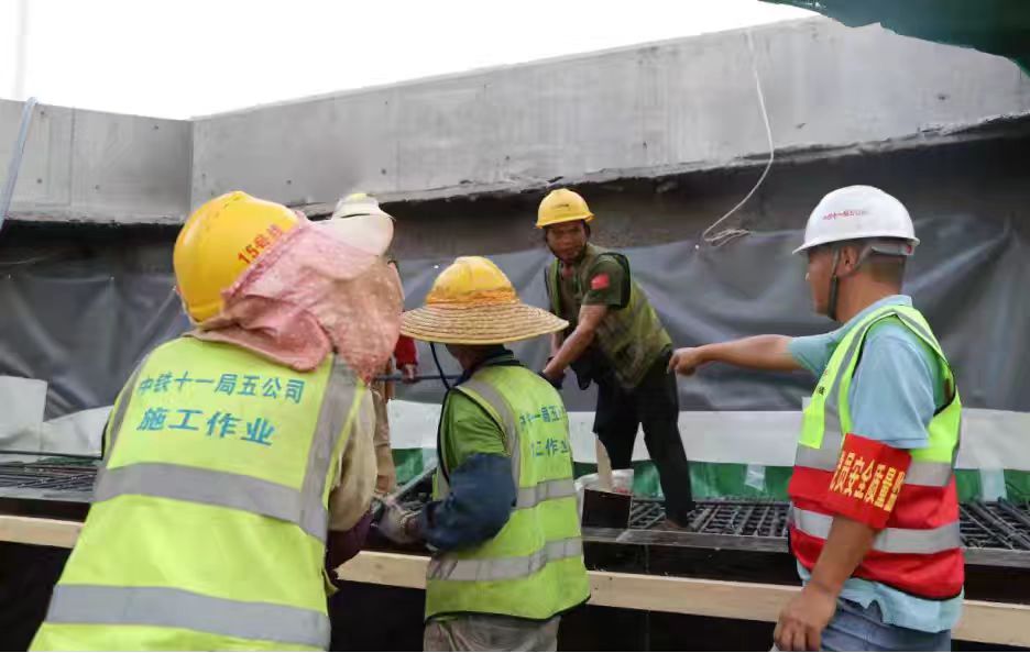 “黨員安全質(zhì)量監(jiān)督崗”崗長張盛偉(右1)在金山寺站施工中堅持旁站監(jiān)督安全質(zhì)量和進度