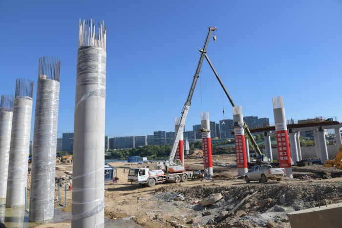 富足山舊橋位于城區(qū)文峰路上,全長(zhǎng)300米、寬18米、高19米,運(yùn)行30年,是常山縣33.6萬(wàn)人出行,與杭州、江西上饒等地密切聯(lián)系的重要通道,被當(dāng)?shù)厝朔Q(chēng)為民生橋。新建富足山大橋在舊橋原址上,與天馬樞紐泄洪閘相距約30米,橋墩和橋面橫跨導(dǎo)流墻。該橋全長(zhǎng)376.8米、11垮、高19米、寬27.5米,直徑1.5—1.8米的樁基46根,直徑1.7米的墩柱42個(gè),9、10垮為通航通道,上部為T(mén)梁結(jié)構(gòu),橋面兩側(cè)各增加2.75米寬的人行道和3米寬的非機(jī)動(dòng)車(chē)道。2024年11月開(kāi)工建設(shè)。該項(xiàng)目在樁基施工中,利用冬春雨水少的特點(diǎn),從兩端向中間推進(jìn),為橋墩施工創(chuàng)造了條件。今年汛期過(guò)后,項(xiàng)目部建起一座100多米長(zhǎng)的漫水橋,右側(cè)5排20根墩柱和蓋梁完成后,填筑起一座6米多高的圍堰,將常山江水改變流向,從完工的墩柱位置流過(guò),抽干左側(cè)河道的積水,組織人力和機(jī)械進(jìn)行樁基施工。在墩柱施工中,采取在破樁頭后的樁基上綁扎鋼筋籠、安裝定型鋼模、一次性灌注的辦法,使拆模后的墩身顏色一致、光潔如玉,受到業(yè)主、監(jiān)理單位的好評(píng)。