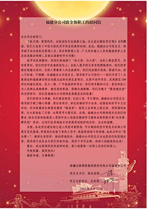 南平訊(馬軼鋒)中秋、國慶雙節(jié)將至,北新路橋集團(tuán)福建分公司發(fā)布《福建分公司致全體職工的慰問信》,充分肯定全體職工在各業(yè)務(wù)范圍、各工作崗位付出的努力和為分公司發(fā)展做出的貢獻(xiàn),代表黨總支、領(lǐng)導(dǎo)班子向全體職工送上節(jié)日的祝福。