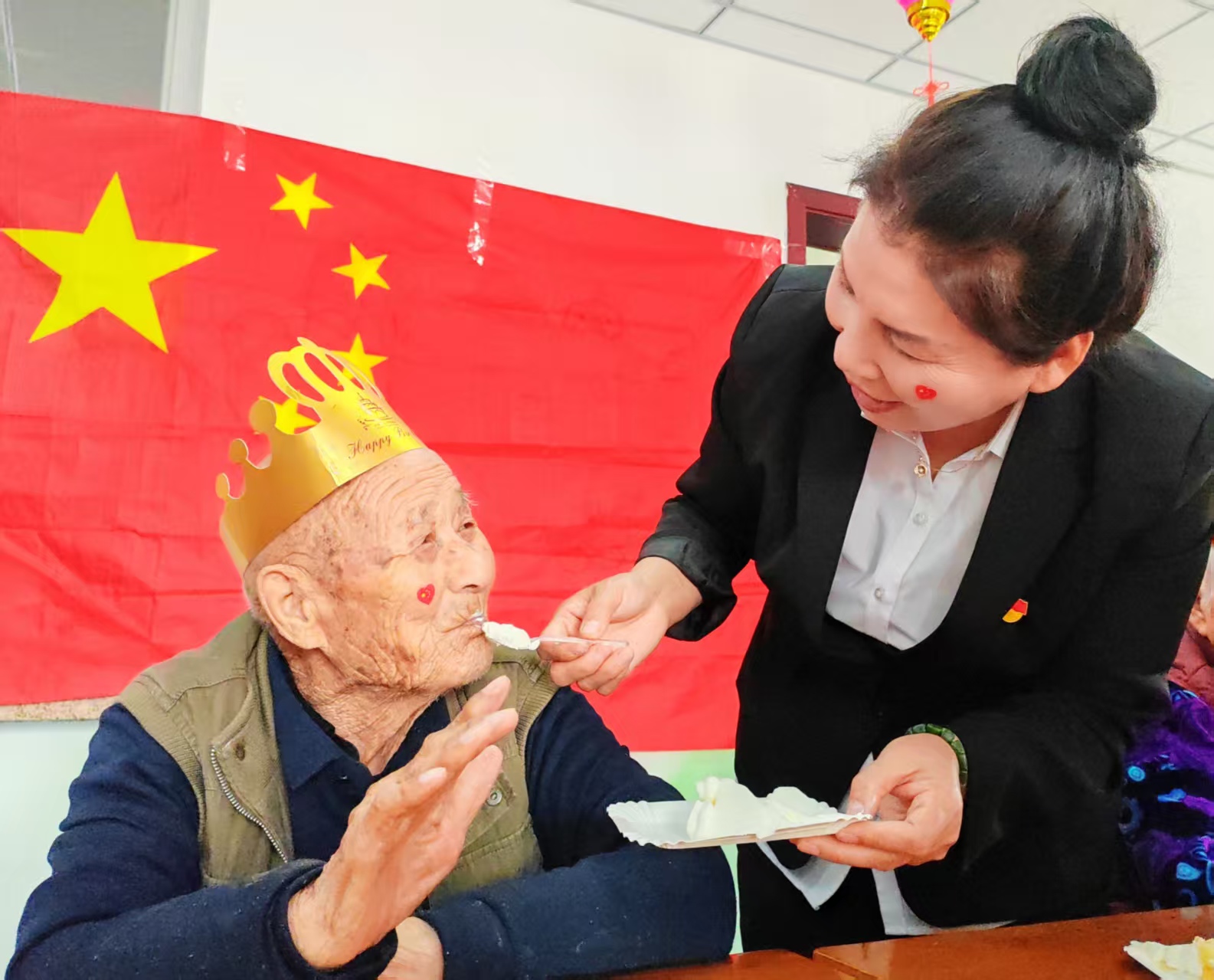 圖1為:奇臺110社區(qū)吾家樂寶養(yǎng)老院院長史云智(右一),在“國慶集體生日會”上,正在給“百歲老壽星”李文生(右二)喂生日蛋糕。