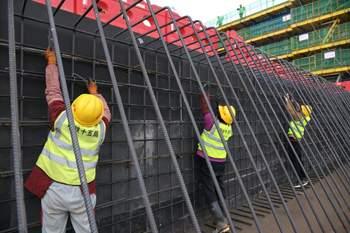 為了加快施工進(jìn)度,項(xiàng)目采用破碎錘、挖掘機(jī)、渣土車、推土機(jī)、鏟車等聯(lián)合作戰(zhàn)的方法,攻克了堅(jiān)硬的地下巖層,開挖出5米深、18米寬、400多米長的基坑。在基底澆筑首層混凝土,布設(shè)底板鋼筋網(wǎng)、安裝定型鋼模,再澆筑混凝土,每道工序環(huán)環(huán)相扣,招賢率先完成3米厚的首倉混凝土施工,白虎灘、閣底相繼澆筑完首倉泄洪閘底板,2倉、3倉……與第一倉工藝流程如出一轍。由于二期泄洪閘墩身底板借鑒了一期的經(jīng)驗(yàn),施工進(jìn)度大提速。