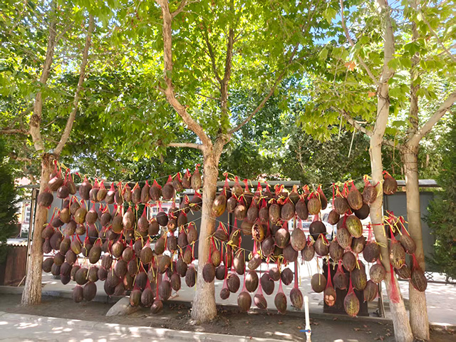 一個午后,中亞分公司的工作人員驅(qū)車抵達蘇魯克村時,只見網(wǎng)兜里的水晶瓜,一排排整齊地懸掛于樹干之間,風動兜搖,瓜香撲鼻,成了蘇魯克村一道別致的風景。村里的人笑著解釋道,“這可是當?shù)氐?lsquo;土智慧’,這樣掛著,不僅通風防潮,延長存放時間,還能讓糖分凝聚,果子就更甜了。”