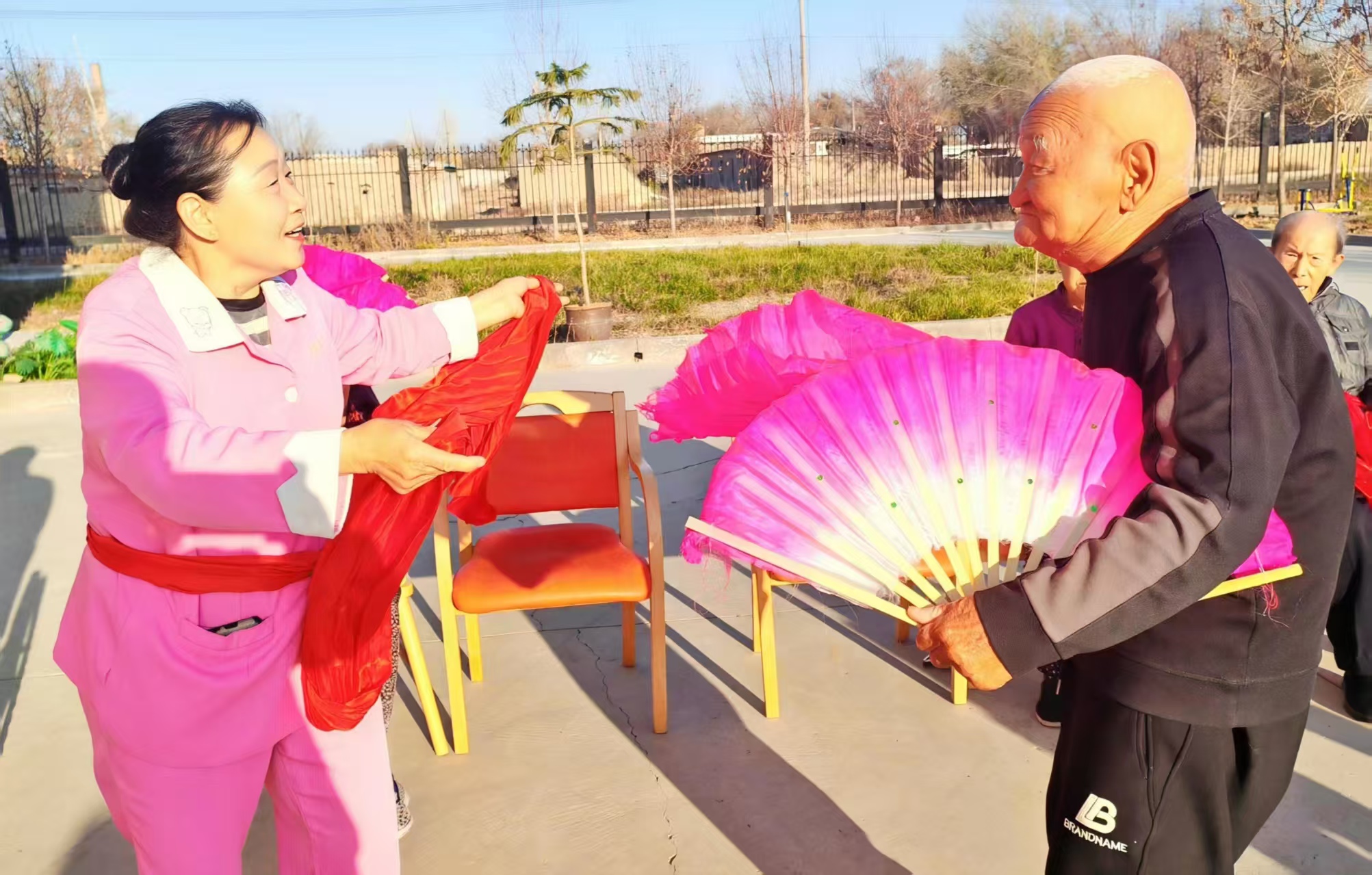 圖2為:六師奇臺(tái)農(nóng)場(chǎng)110社區(qū)吾家樂寶養(yǎng)老院97歲“老寶貝”張振民老爺爺(右 ),與護(hù)理員競(jìng)舞秧歌,用充滿活力的舞步,宣告自己桑榆不老。