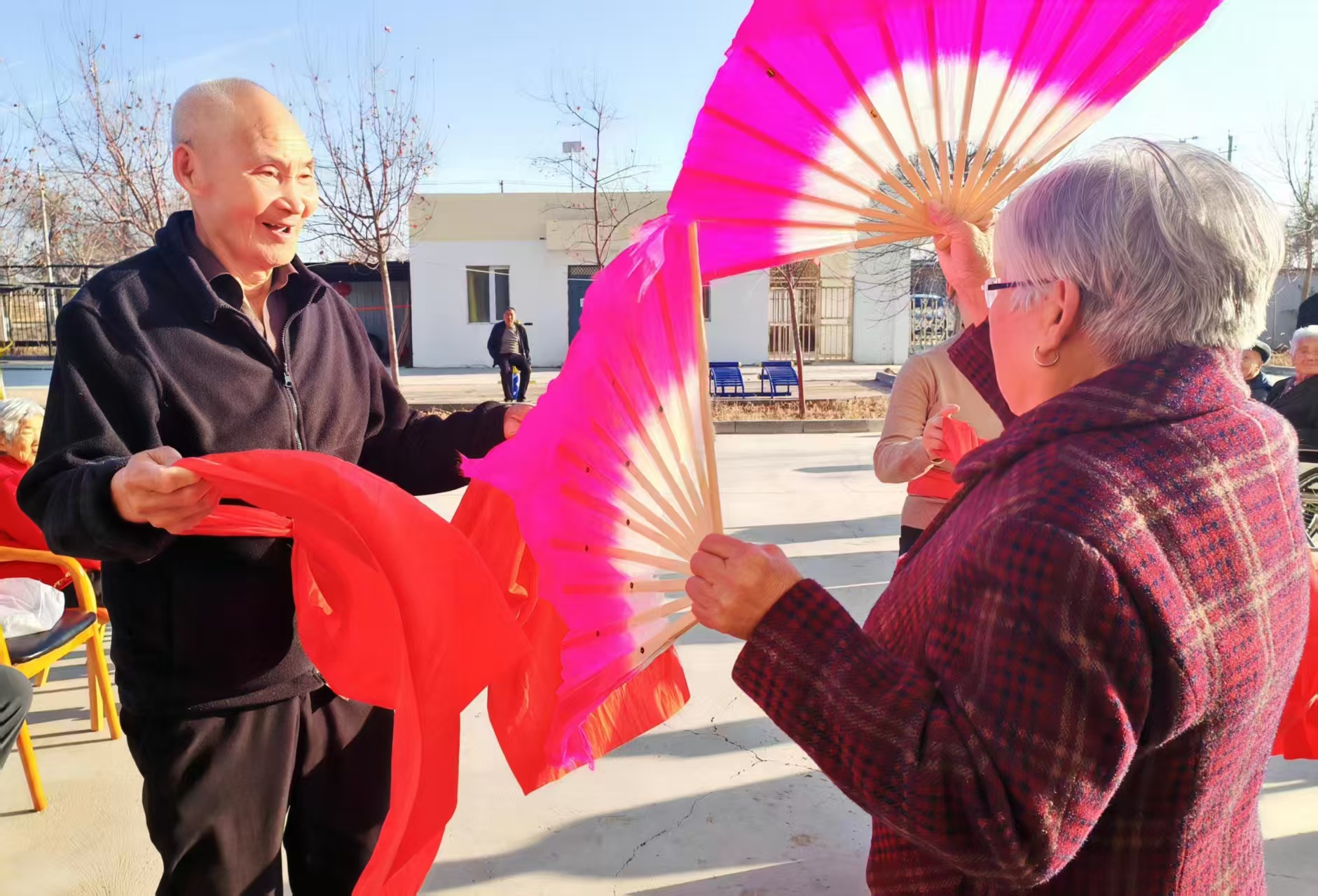 重陽節(jié)當(dāng)天下午,溫暖的陽光灑遍六師奇臺(tái)農(nóng)場(chǎng)110社區(qū)吾家樂寶養(yǎng)老院的每一個(gè)角落。這里熱鬧非凡,長(zhǎng)者們手舞紅綢,精神抖擻,滿心歡喜地參加該養(yǎng)老院組織開展的以“紅綢舞動(dòng)慶重陽”為主題的文化娛樂活動(dòng)。97歲高齡的張振民老爺爺,手舞紅扇,舞步輕盈,在秋日陽光的照映下,滿面紅光,向在場(chǎng)的人們展現(xiàn)出了當(dāng)年充滿青春活力的風(fēng)采。六師奇臺(tái)農(nóng)場(chǎng)110社區(qū)吾家樂寶養(yǎng)老院的“老寶貝們”,“九九重陽”心中暖暖,情意濃濃,心中充滿了愉悅,在歡快的秧歌聲中度過了一個(gè)美好的重陽佳節(jié)。
