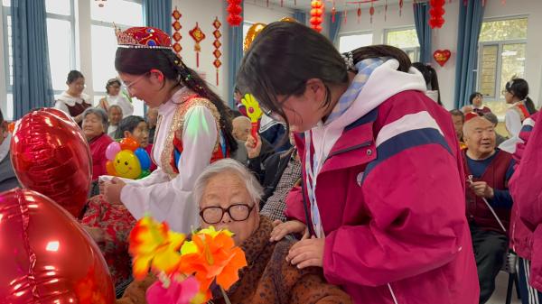 在親切的嘮家常環(huán)節(jié),學(xué)生們圍坐在長者身旁,傾聽他們講述過去的故事,分享生活中的趣事。一張張笑臉、一聲聲問候,讓整個養(yǎng)老院都沉浸在溫馨和睦的氛圍里,也讓長者們在重陽佳節(jié)感受到了如同家人般的陪伴與關(guān)愛。