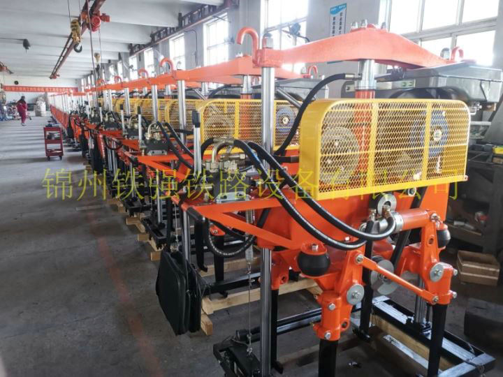 4、將走行架放在線路上,走行輪要對(duì)正兩根鋼軌,將升降缸提到最上端的兩臺(tái)搗固機(jī)依次推到放平的走架上,分別對(duì)準(zhǔn)位置,將前后大插銷插入定位孔內(nèi),再將下道架折起,把下道架上的支撐掛鉤與走行架的勾環(huán)勾住。作業(yè)中,操縱司機(jī)最好面向來(lái)車方向。