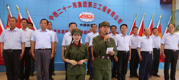 下午4時(shí),項(xiàng)目部會(huì)議室莊嚴(yán)肅穆。主持人張生晶、向前身著65式軍服,鮮紅的帽徽領(lǐng)章在綠軍裝的映襯下格外鮮艷奪目。當(dāng)她們用標(biāo)準(zhǔn)的普通話宣布三公司平天高速公路一標(biāo)項(xiàng)目部“講述鐵道兵故事,弘揚(yáng)鐵道兵精神”主題活動(dòng)暨紀(jì)念“八一”建軍節(jié)活動(dòng)隆重開幕時(shí),臺(tái)下響起了經(jīng)久不息的熱烈掌聲。