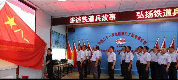 在魏總作了熱情洋溢的致辭后,身著統(tǒng)一服裝的鐵道兵老同志們聽從口令,邁著整齊的步伐,雄糾糾氣昂昂地走上主席臺(tái)。他們仿佛又重返軍營(yíng),回到了激情燃燒的歲月。一個(gè)個(gè)堅(jiān)毅的目光中充滿了自信與驕傲,他們用激昂的聲音高唱“鐵道兵志在四方”、“戰(zhàn)友之歌”,雄壯的歌聲響徹云霄,與會(huì)者無(wú)不深受感染和激動(dòng)萬(wàn)分。就在高亢的歌聲剛一結(jié)束時(shí),兩名年輕員工展開了“八一”軍旗,老兵們?cè)诳诹畹闹笓]下,整齊地向右轉(zhuǎn),向軍旗莊重地敬軍禮。