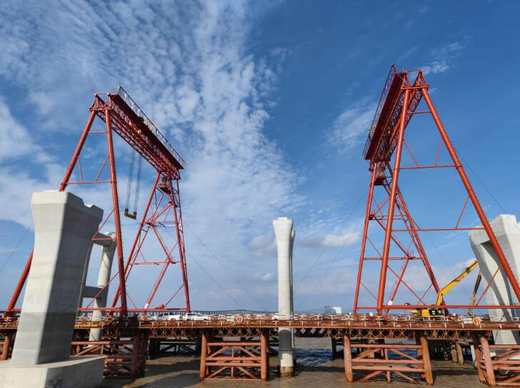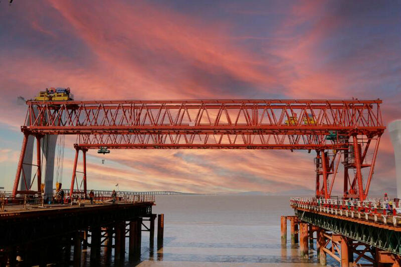 濱?;ネㄔO(shè)計(jì)142片鋼箱梁、299片疊合梁,單片重20—30噸、長(zhǎng)20—60米,架設(shè)好的30片梁,一部分是通過(guò)公路從舟山梁場(chǎng)運(yùn)至現(xiàn)場(chǎng),一部分是海上運(yùn)輸至石化區(qū)碼頭,轉(zhuǎn)運(yùn)至工地。由于梁體超長(zhǎng)超寬,公路運(yùn)輸安全風(fēng)險(xiǎn)大,租賃石化區(qū)碼頭卸梁再轉(zhuǎn)運(yùn),費(fèi)時(shí)費(fèi)力,影響進(jìn)度。該項(xiàng)目部從安全、效率、成本等多方面考慮,決定在互通區(qū)建1座卸梁站、2座提梁站。前期經(jīng)過(guò)實(shí)地勘察,確定了卸梁站和2座提梁站位置,組織人員編制出實(shí)施方案,經(jīng)多方專(zhuān)家評(píng)審?fù)ㄟ^(guò),報(bào)業(yè)主、鎮(zhèn)海區(qū)海事處審批后付諸實(shí)施。在聯(lián)系聯(lián)系廠家加工龍門(mén)吊的同時(shí),組織力量拆除區(qū)域內(nèi)的棧橋,深挖卸梁站航道內(nèi)的淤泥,克服多種困難,于7月13日建成36,4米高、16,8米寬的卸梁站。在兩座提梁站建設(shè)中,該項(xiàng)目部戰(zhàn)勝高溫、大風(fēng)大雨等極端天氣造成的困難,8月初建成1號(hào)提梁站并通過(guò)有關(guān)方面驗(yàn)收。在2號(hào)提梁站施工中,遭遇兩次強(qiáng)臺(tái)風(fēng),施工受阻,項(xiàng)目部采取科技公關(guān)、優(yōu)化資源等舉措,將臺(tái)風(fēng)造成的損失奪了回來(lái),如期建成74米長(zhǎng)、36米高、15米寬、負(fù)荷200噸的2號(hào)提梁站。兩座提梁站和1座卸梁站使用鋼材250余噸。