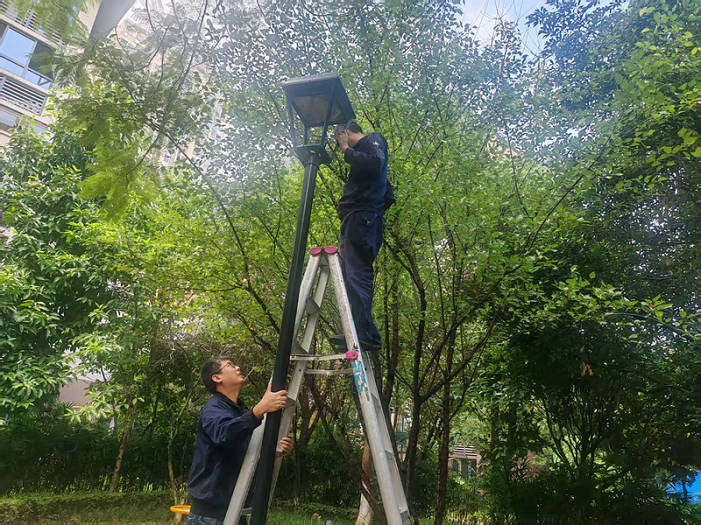 夜幕降臨時(shí),他們化身“光亮守護(hù)者”穿梭于樹叢樓宇間。搭梯登高檢修路燈線路、手持加長(zhǎng)工具清潔燈罩、加固燈桿、排查線路、更換燈泡、調(diào)試亮度,每一個(gè)步驟都一絲不茍。維修員們用專業(yè)操作確保每一盞路燈準(zhǔn)時(shí)亮起,為居民夜間出行鋪就安全通道。