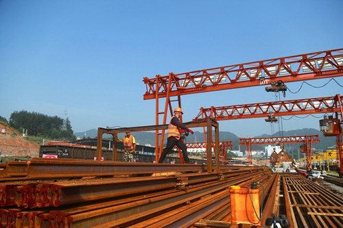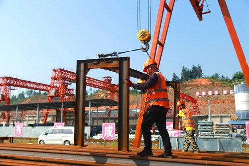 (譚帥)“確認(rèn)夾板掛裝牢固,準(zhǔn)備起吊,速度一定要慢,確保安全”,5月18日,渝懷鐵路涪秀二線中鐵一局鋪架項目的釘聯(lián)生產(chǎn)區(qū)內(nèi)迎來了新“神器”。當(dāng)天上午9時許,隨著兩臺小行吊設(shè)備的緩緩滑動,一節(jié)長25米的鋼軌成功起吊,隨后工人們十分順利地開始鉆孔作業(yè)工序。