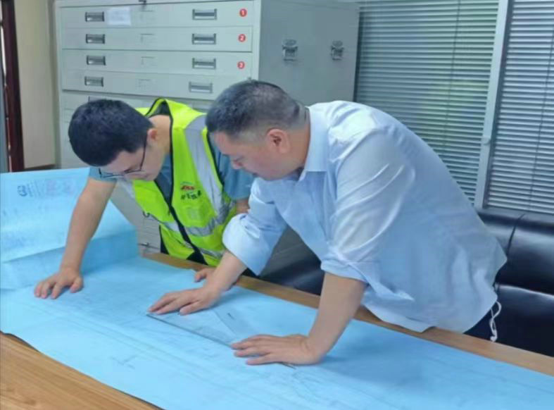 鄧林義(右)在指導(dǎo)唐磊(左)看圖紙