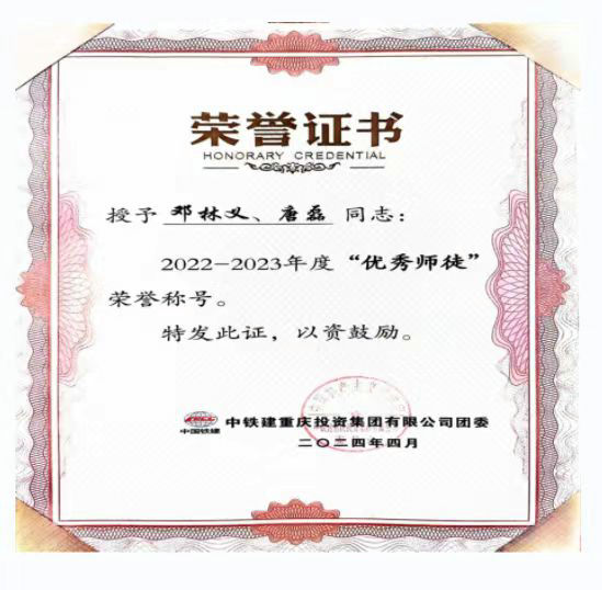 4月29日,在中鐵建重慶投資集團(tuán)召開“導(dǎo)師帶徒”活動(dòng)總結(jié)表彰大會(huì)上,中鐵建重慶軌道交通15號(hào)線二期總承包部工程管理部經(jīng)理鄧林義,部員唐磊榮獲2022--2023年度“優(yōu)秀師徒”榮譽(yù)稱號(hào),這是對師徒取得成果的肯定,也是對師徒的鼓勵(lì)。