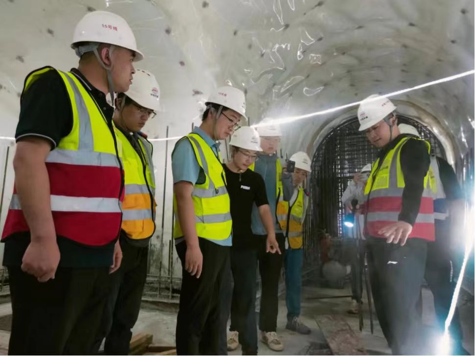 項(xiàng)目部總工程師李文慶(左三)與項(xiàng)目經(jīng)理阮超(右一)現(xiàn)場(chǎng)副經(jīng)理宋利(左一)在盾構(gòu)聯(lián)絡(luò)通道施工進(jìn)行質(zhì)量、安全檢查指導(dǎo)