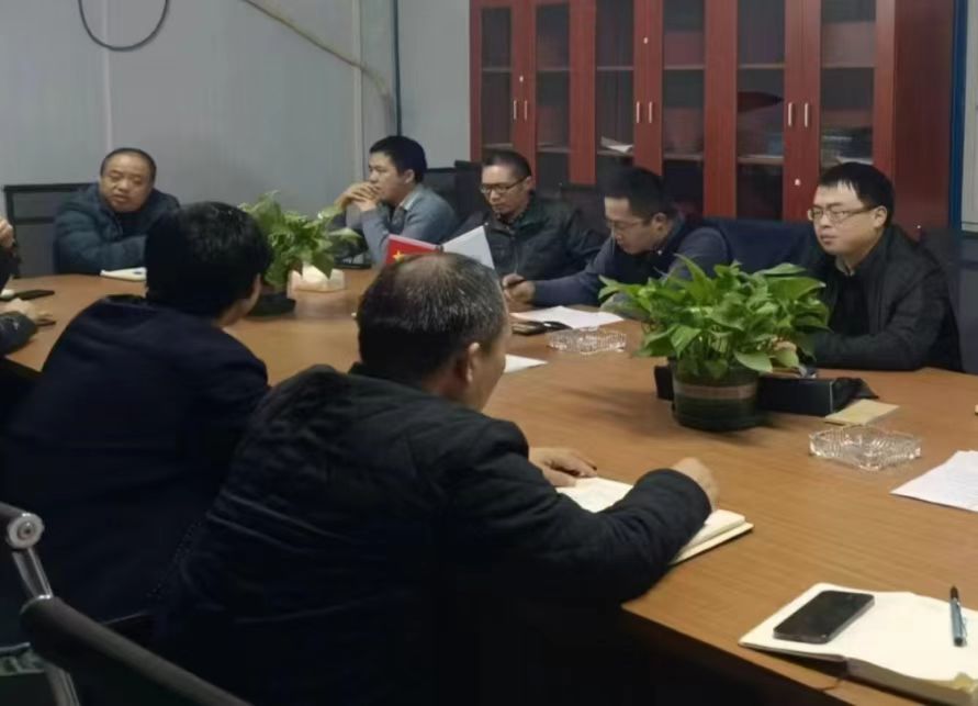 宋庭(右1)和項(xiàng)目經(jīng)理阮超(右2)組織召開(kāi)加快中梁山隧道施工進(jìn)度研討會(huì)