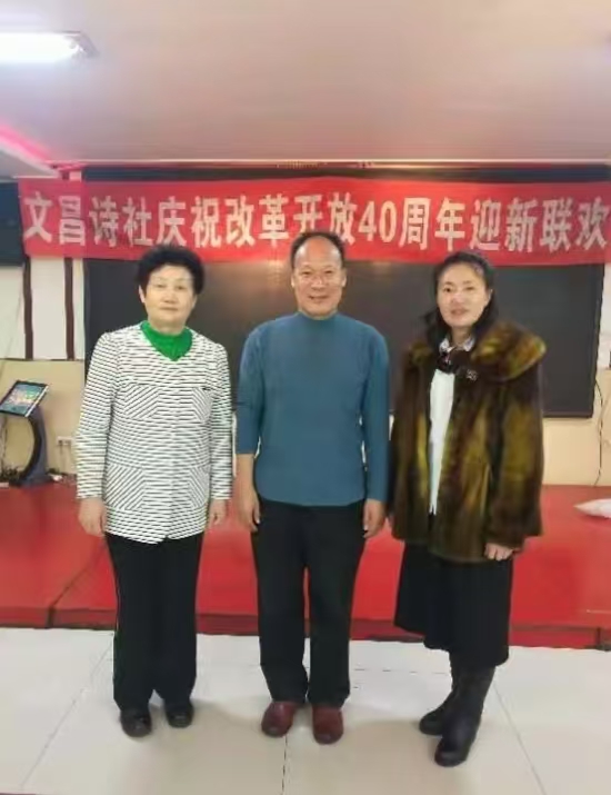 杜曉言與樺南詩詞協(xié)會主席郭曉春社長(左)、樺南詩詞協(xié)會秘書長劉鈺華(右)2018迎新聯(lián)歡會合影