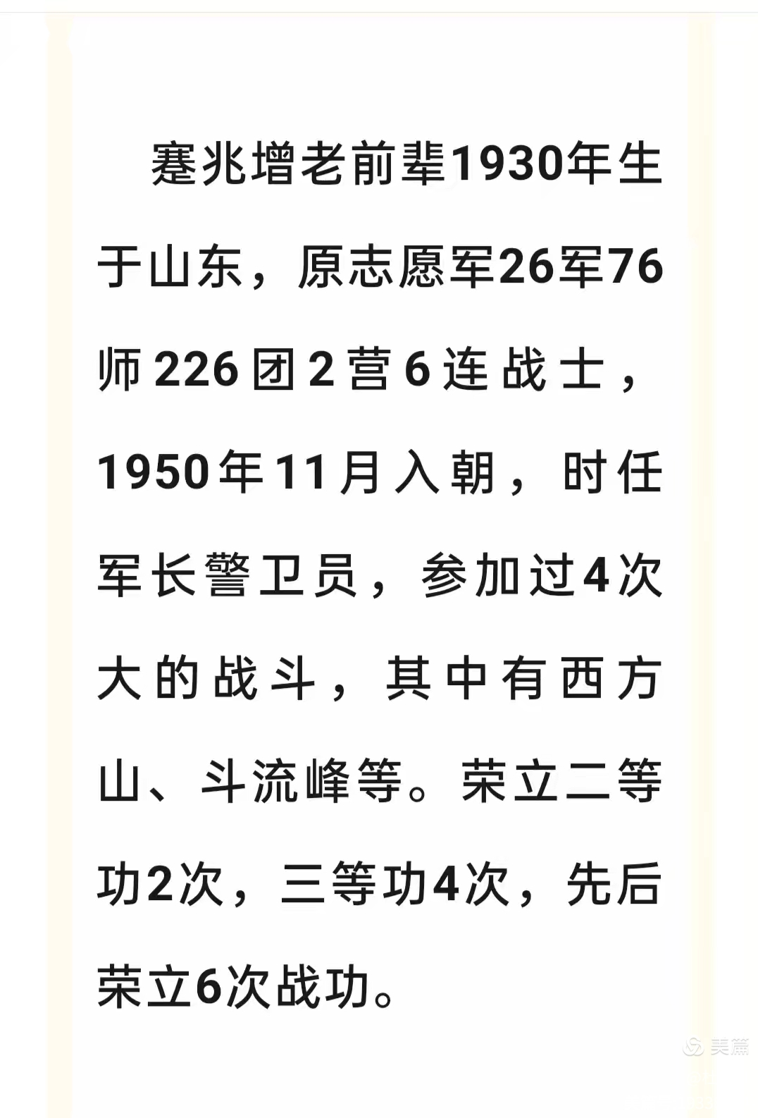 第一次在抖音刷到蹇兆增老英雄的視頻時,我就被深深吸引。視頻中的他,雖已年近百歲,身形佝僂,卻難掩歲月沉淀下的堅毅。他操著濃厚鄉(xiāng)音,緩緩講述著抗美援朝戰(zhàn)場上的生死瞬間:零下40多度的極寒天氣里,身著單薄棉衣,吃著冰冷炒面,武器裝備更是遠不如敵人 ,可面對如潮水般涌來的美軍,他和戰(zhàn)友們毫無懼色,先后參加4次大戰(zhàn)役,多次沖鋒在上甘嶺戰(zhàn)場,一天打退敵人十七次進攻 ,哪怕幾天喝不上一滴水,也未曾退縮一步。當(dāng)他說到用不太流利的英語喊出“繳槍不殺,優(yōu)待俘虜”時,那質(zhì)樸又充滿力量的畫面,瞬間讓我穿越時空,仿佛看到了當(dāng)年志愿軍戰(zhàn)士們在槍林彈雨中英勇奮戰(zhàn)的身影。