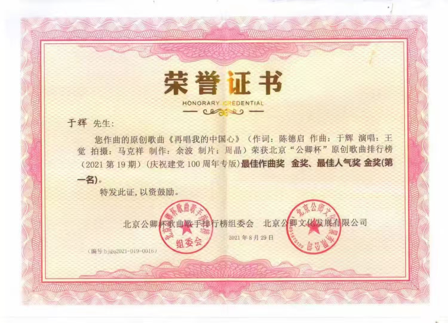 于輝的創(chuàng)作始終緊扣時代脈搏,多部作品在重大主題征集活動中脫穎而出。2021年建黨百年之際,他創(chuàng)作的《尋你的路是一座座青山》《再唱我的中國心》雙獲中共河南省委宣傳部等單位聯(lián)合評選的金獎,其中《再唱我的中國心》更持續(xù)發(fā)力,后續(xù)斬獲中國國際教育電視臺金獎、教育部白名單賽事銀獎等多項榮譽,成為跨年度傳播的主旋律佳作 。