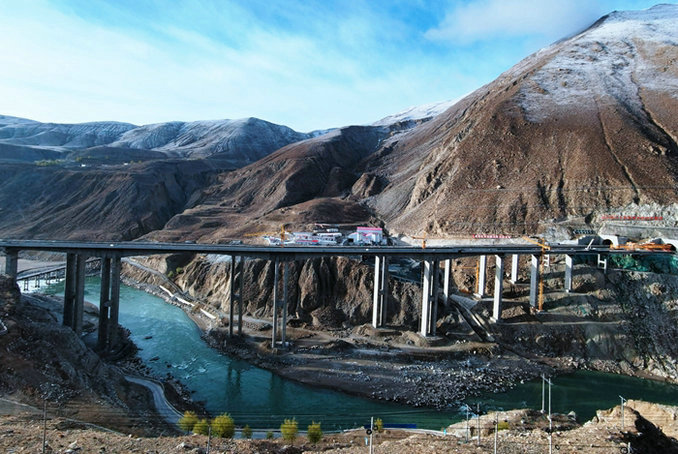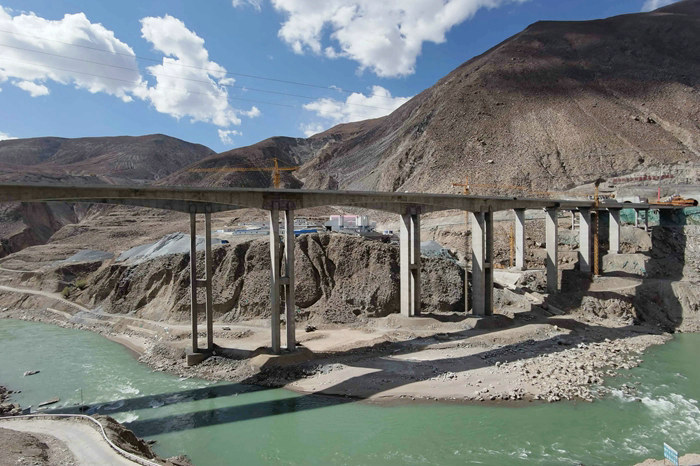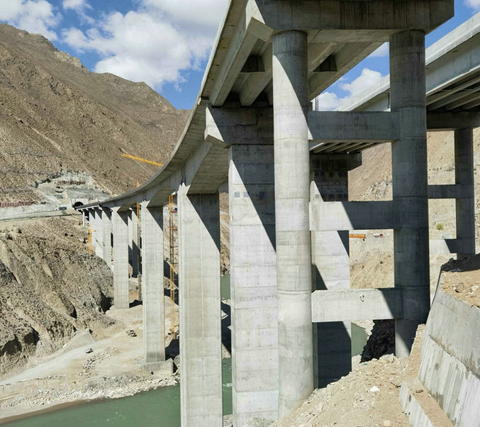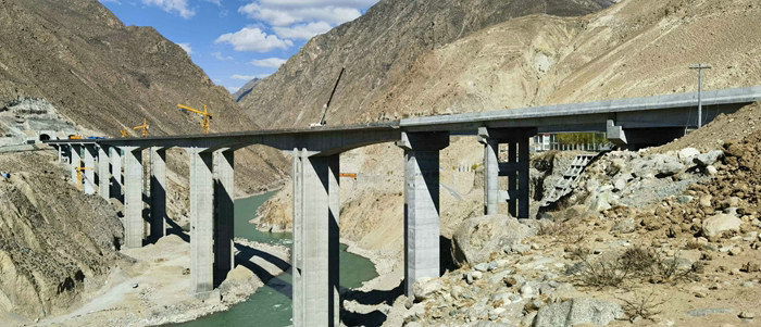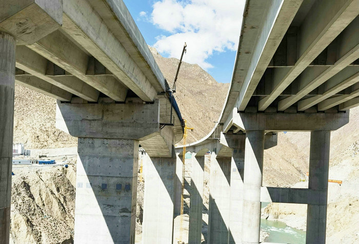 中鐵十五局集團(tuán)雅葉高速拉日十標(biāo)項目雅魯藏布江大橋位于拉薩市尼木縣卡如鄉(xiāng)卡如村西側(cè)約700米,以近東西走向跨越雅魯藏布江。大橋為左右線分離式,單幅橋?qū)?2.75米,公路等級為高速公路雙向4車道,設(shè)計速度100km/h,車輛荷載等級為公路Ⅰ級。橋梁下部結(jié)構(gòu)采用柱式墩、實心薄壁墩、空心薄壁墩、雙肢等截面矩形實體薄壁墩,橋臺為樁柱式橋臺,基礎(chǔ)結(jié)構(gòu)采用樁基礎(chǔ)。左線橋梁全長734.5m,右線橋梁全長725.5m。其中主橋采用變截面預(yù)應(yīng)力混凝土連續(xù)剛構(gòu),兩岸引橋結(jié)合地形條件采用30m預(yù)應(yīng)力混凝土先簡支后橋面連續(xù)小箱梁和40m預(yù)應(yīng)力混凝土先簡支后橋面連續(xù)T梁。兩岸的橋墩位位于河谷陡峭河岸邊坡上,墩身較高、現(xiàn)澆段跨度較大,橋面橫風(fēng)較大橋面系工程存在高空作業(yè),安全風(fēng)險較高。目前大橋已經(jīng)架通,為下一步完成全面建設(shè)任務(wù)進(jìn)了一大步。