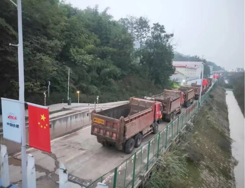 國慶期間,中梁山隧道進口施工便道運輸棄渣的車隊成河,在施工便道國旗的輝映下,襯托出濃郁的國慶的氣氛。