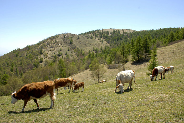 初夏,放養(yǎng)的花牛在啃食剛發(fā)芽的嫩草