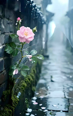 凸顯雨中屋檐下?lián)伍_粉色清幽