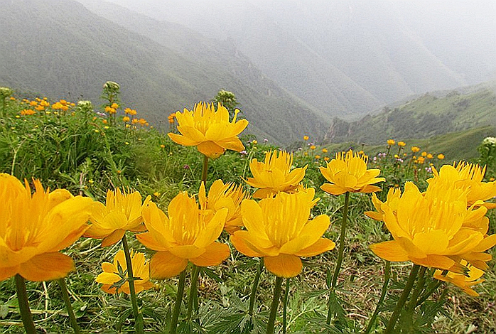 清晨的駝梁山頂,常常被薄霧籠罩。金蓮花在霧中若隱若現(xiàn),像披著輕紗的仙子,花瓣上掛著晶瑩的露珠,輕輕一碰便滾落下來,滴在泥土里,滋養(yǎng)著新的生命。等到太陽升起,霧氣散去,花海便又恢復了熱烈的模樣,游客的笑聲、相機的快門聲、蜜蜂的嗡嗡聲,與山間的鳥鳴、溪流的潺潺聲交織在一起,成了最生動的山間樂章。傍晚時分,夕陽為金蓮花鍍上了一層暖紅,花海從明黃變成了橙金,與遠處的晚霞相映成趣,引得不少游客駐足遠眺,遲遲不愿下山。
