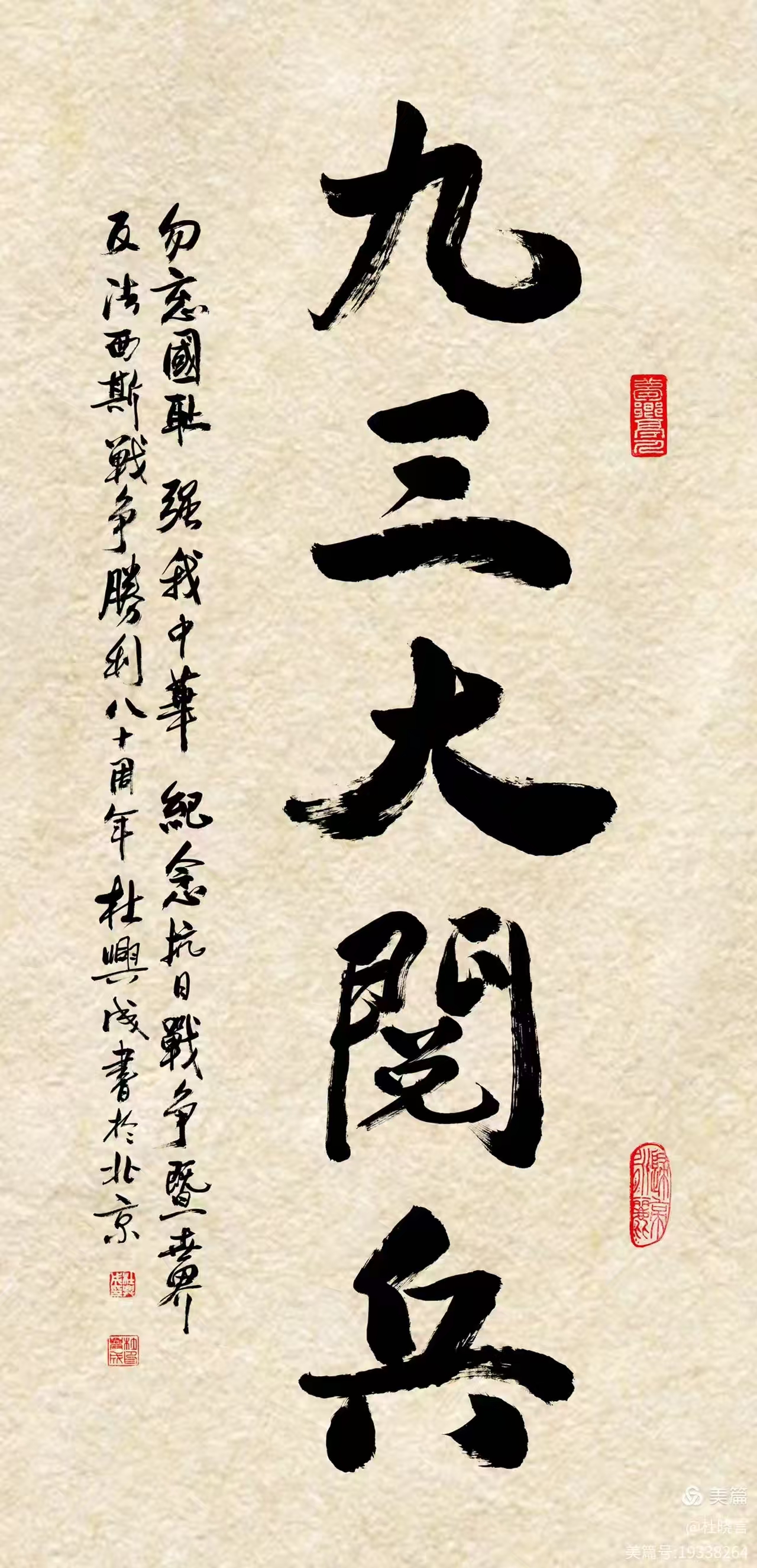 9月3日,紀(jì)念中國(guó)人民抗日戰(zhàn)爭(zhēng)暨世界反法西斯戰(zhàn)爭(zhēng)勝利80周年閱兵在北京舉行。觀看閱兵實(shí)況后,著名軍旅詞曲作家、《戰(zhàn)友之歌》創(chuàng)作者杜興成立即揮毫,以“九三大閱兵”為題創(chuàng)作書(shū)法作品,抒發(fā)強(qiáng)烈愛(ài)國(guó)主義情懷 。