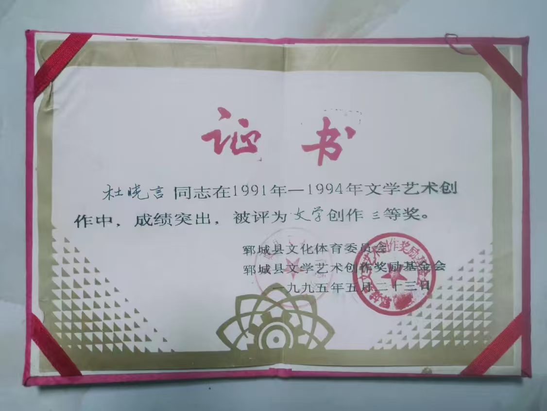 最讓我心頭溫?zé)岬模菙R在最里層的1991至1994年文學(xué)藝術(shù)創(chuàng)作獎(jiǎng)證書。淡粉紅色封皮上,“鄆城縣文化體育委員會”“鄆城縣文學(xué)藝術(shù)獎(jiǎng)勵(lì)基金會”的字跡雖染了時(shí)光淡痕,卻仍像當(dāng)年那般,透著沉甸甸的暖意。記得那年深秋,我攥著寫滿手稿的本子,反復(fù)往縣文化館跑。窗外法桐葉落了滿地,館里的燈光卻格外亮堂,編輯老師逐字逐句改稿的筆尖,在紙上劃出細(xì)碎聲響,也在我心里種下了光。后來接到領(lǐng)獎(jiǎng)通知,我攥著信在巷口站了許久,連風(fēng)里都裹著甜——那是我的文字第一次被認(rèn)可,是鄆城這片土地,給了我最初的文學(xué)底氣。